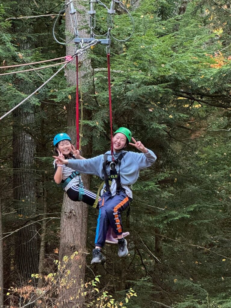 Two Grade 5 students conquer the Team Swing. It take everyone in the group to pull them up and some bravery to swing more than 40 feet in the air. Team building is a big part of our Camp experiences.
