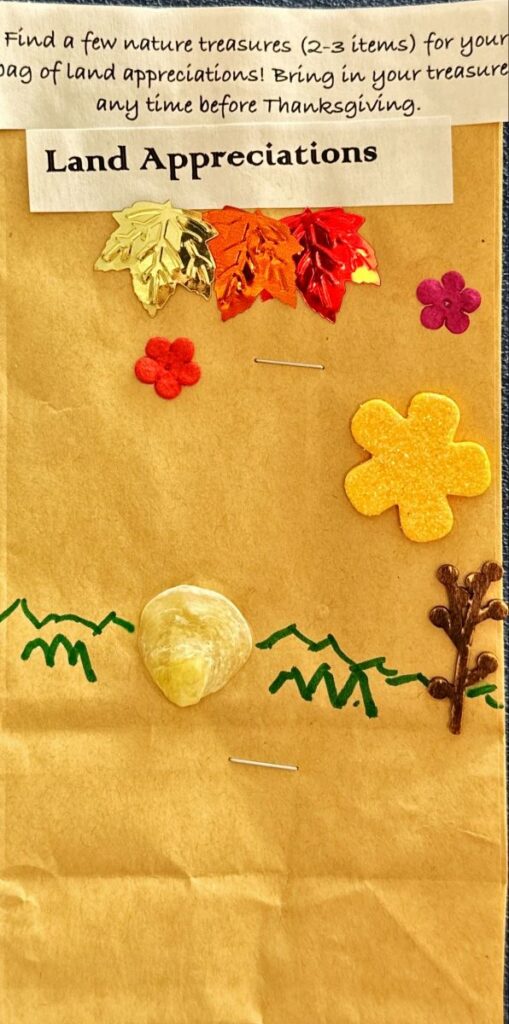 After reading the story Shi-shi-etko and Shin-chin’s Canoe by Nicola I. Campbell, the Grade One class went out to find their own “Land Appreciations” from some of their favourite places outdoors. We then shared our appreciations and made a class collage.