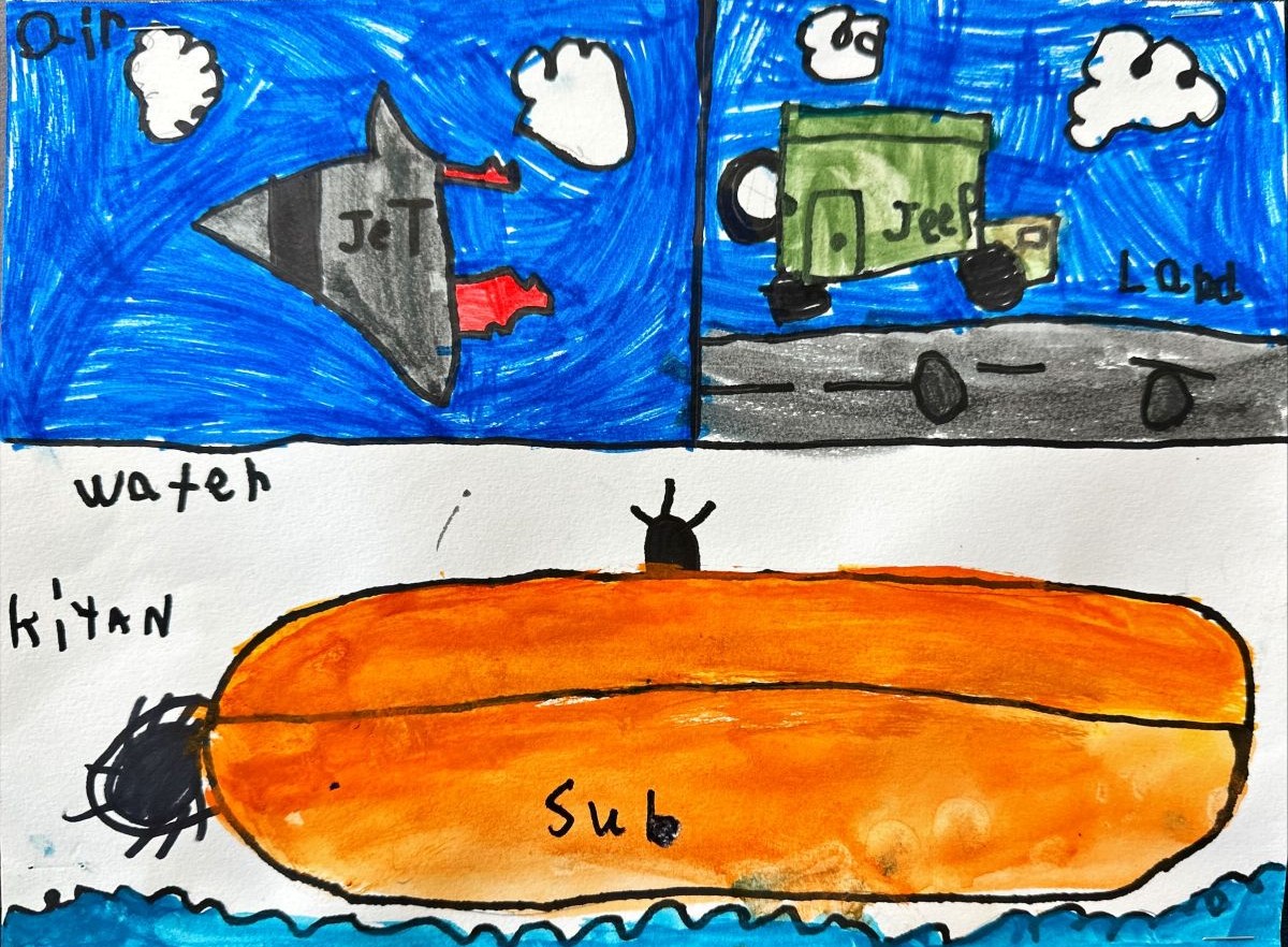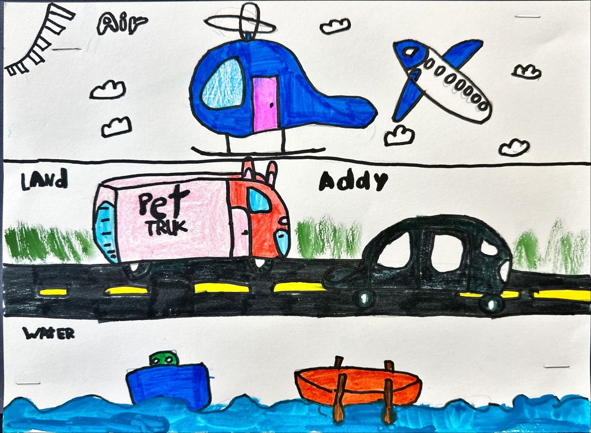 In connection with our Move It Unit, the Grade One class created some watercolour art to depict the three types of transportation – Land, Water, and Air.
