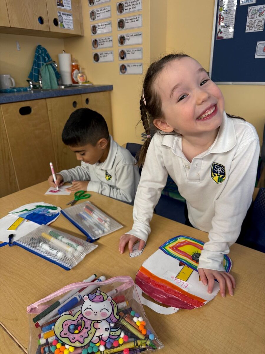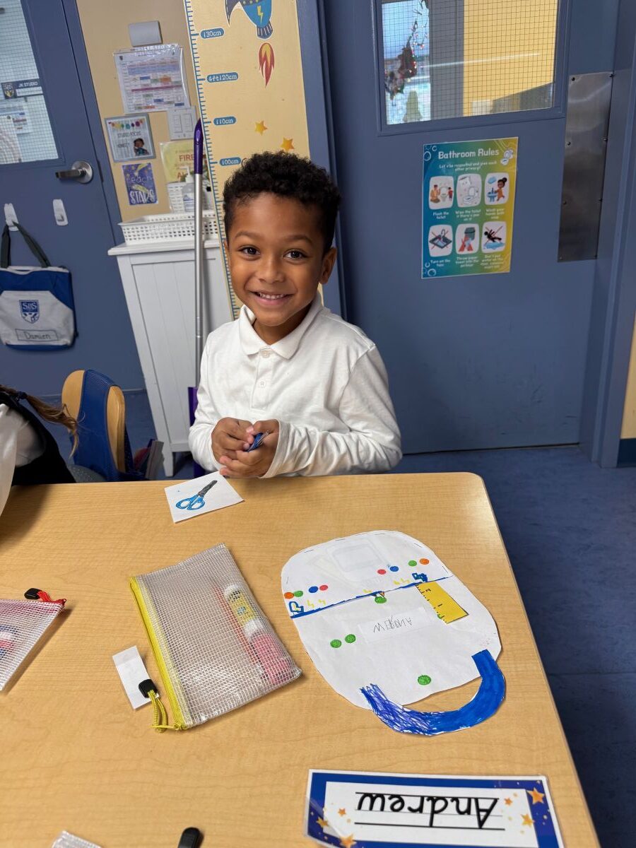 In SK, we’ve been discussing school supplies. Each student created their own backpack and chose different supplies to add to it. Students then practiced sharing what was in their bag using the sentence “Dans mon sac à dos, j’ai…“.
