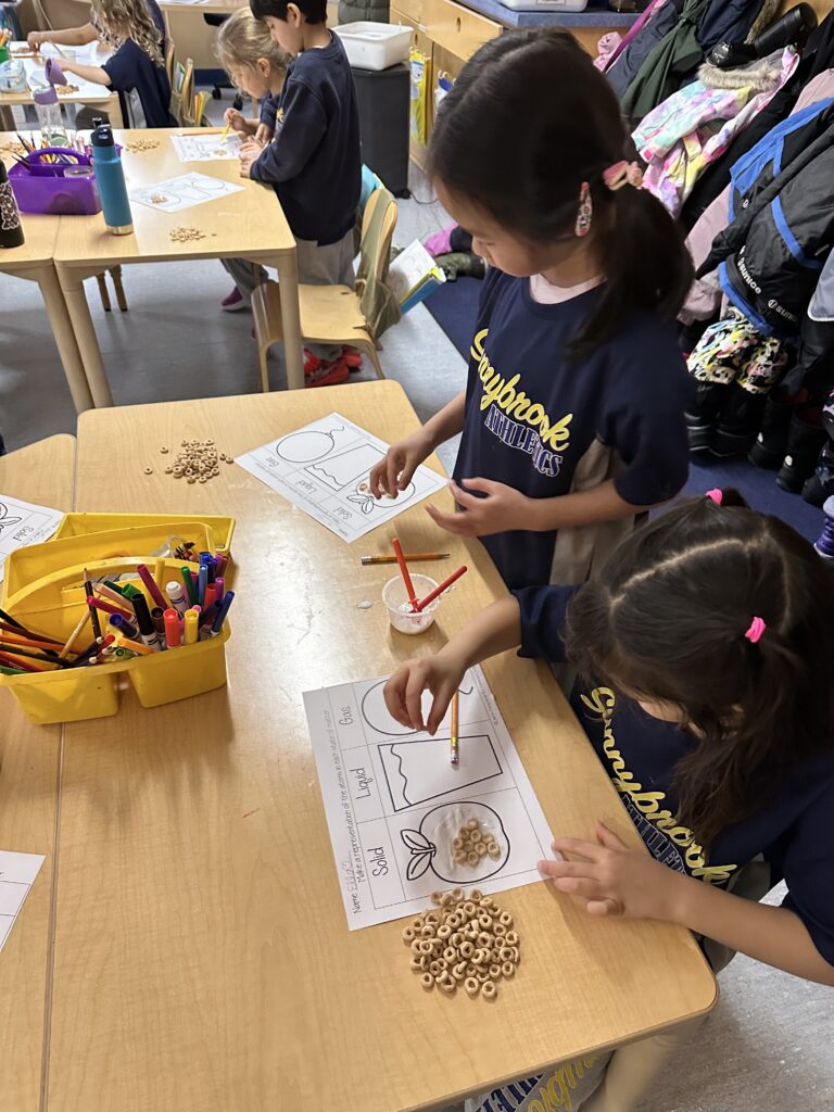 Each student in Grade 1 is given a template showing an example of a solid, a liquid, and a gas. They then use Cheerios to model how molecules are arranged and move in each state of matter.